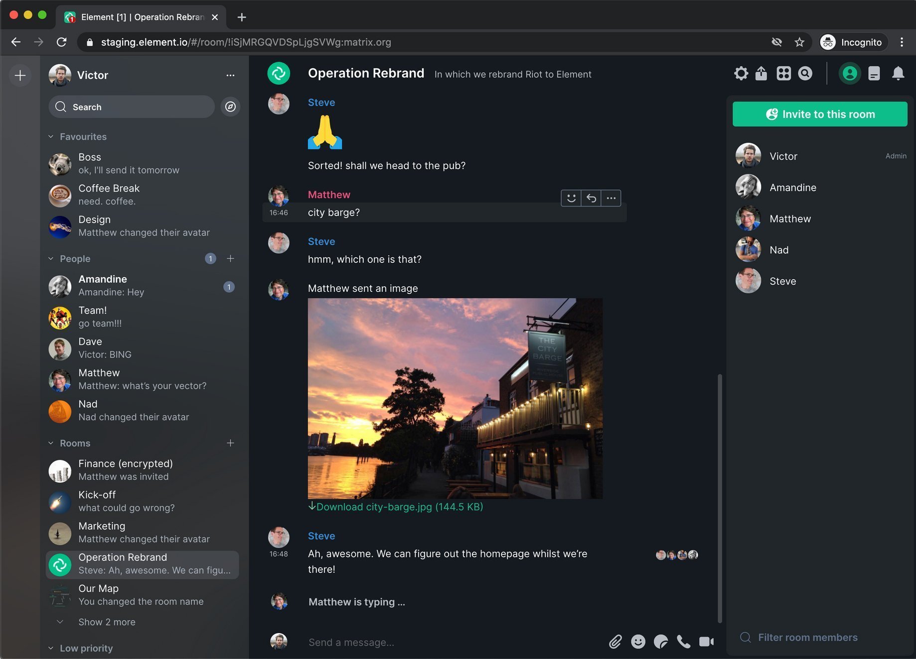 Uçtan uca şifreleme ve çapraz imzalı cihaz doğrulaması ile korunan sohbet uygulaması, ekipler, arkadaşlar ve kuruluşlarla işbirliği yapmak için güvenli bir seçenek olacak şekilde tasarlanmıştır. Genel platformun, kullanıcılara topluluklar oluşturma, metin mesajları gönderme ve bir grup veya topluluk içinde video konferans başlatma şansı veren Slack’e açık kaynaklı bir alternatif olması amaçlanmıştır. Her şeyden önce bir sohbet uygulaması olan Element, katılımcıları sessize alma / açma ve toplantıları planlama gibi diğer platformlar tarafından sunulan bazı gelişmiş video konferans özelliklerinden yoksundur.